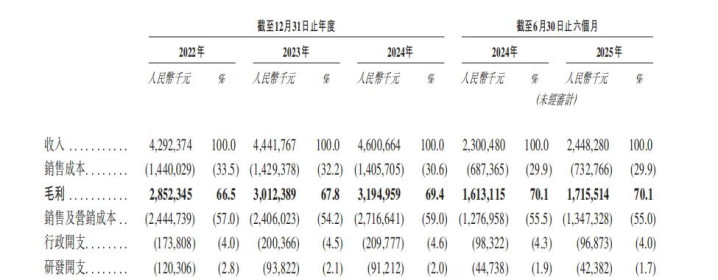 招股书披露,2024年销售及营销成本同比增长12.9%,高于收入3.6%的增幅。如果将销售及营销成本分来看,营销和推广开支在其中占比越来越高。2022年,营销及推广开支在销售及营销成本中的占比是70.0%;2023年是71.5%;到了2024年已经升到75.8%。截至2025年6月30日,这个占比继续升到77.5%。